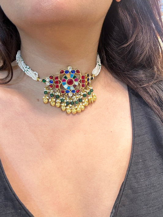 Handmade Navratna Style Choker Set - Multi-Gemstone Gold Plated Indian Necklace & Earrings - Ethnic Statement Set