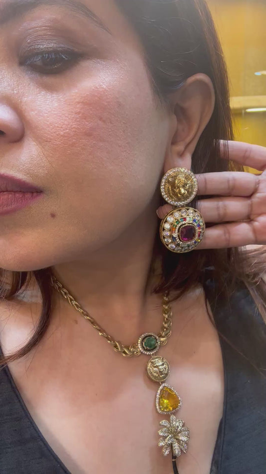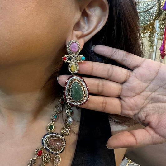 Victorian Polki Inspired Necklace with Oversized Drop Earrings - Festive Mughal Statement Jewelry