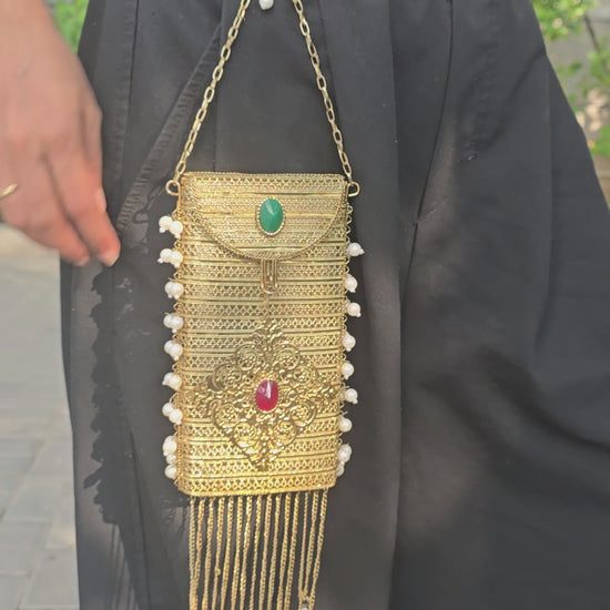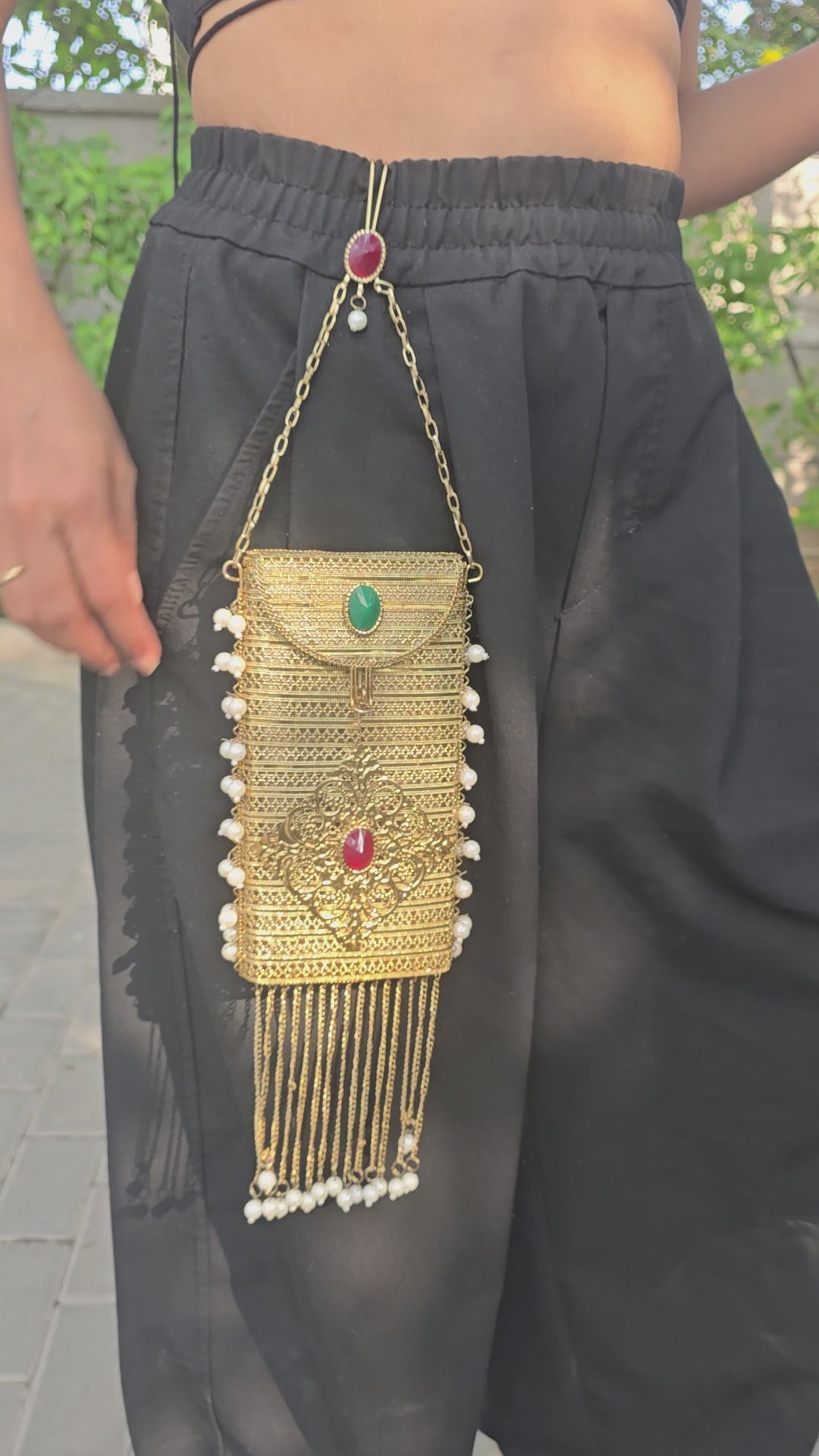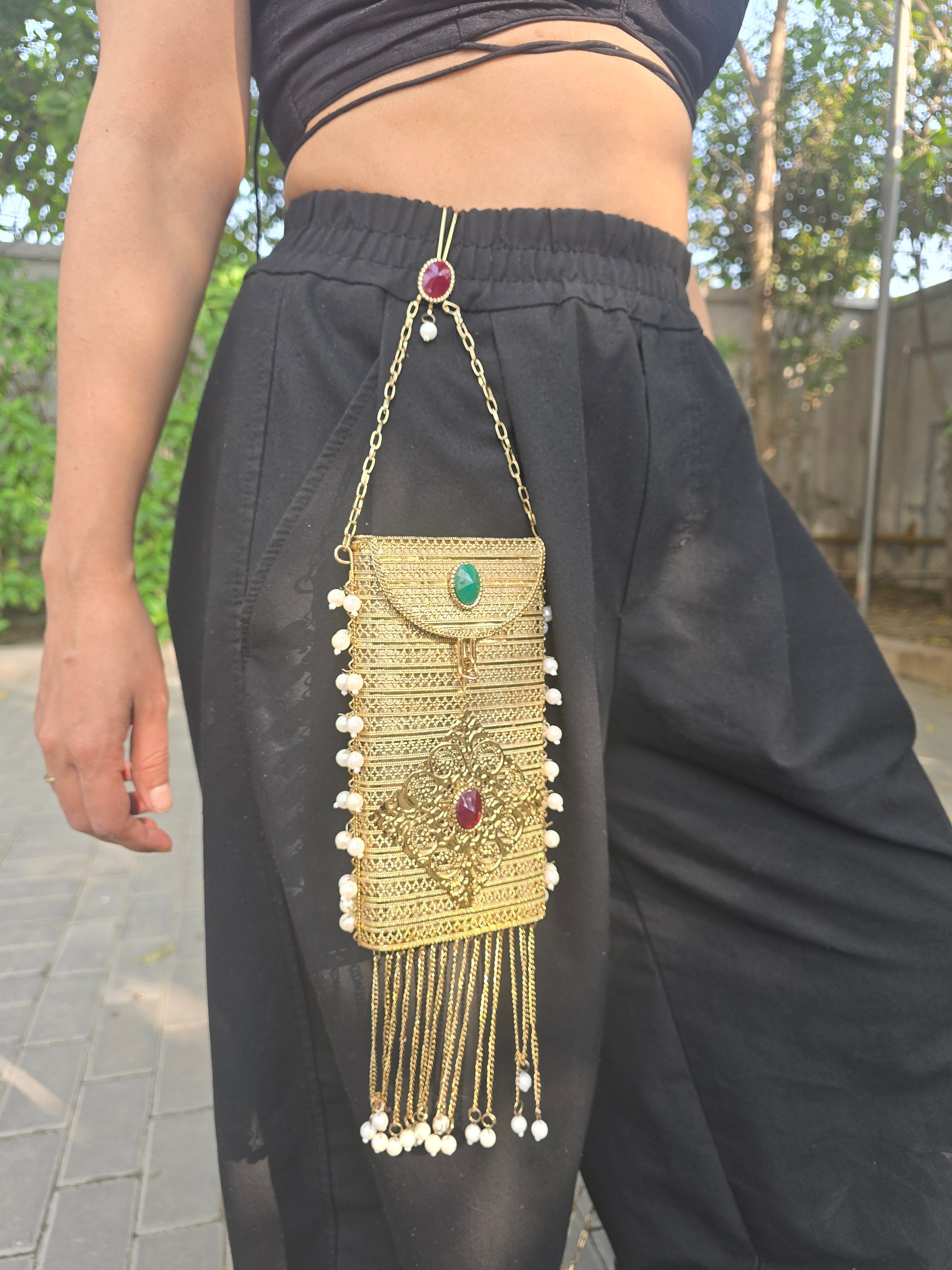 The ornate front motif, highlighted with rich red and green stone detailing, lends a regal touch inspired by traditional heirloom designs. Compact yet functional, it is perfect for carrying your mobile and small essentials while elevating your ethnic or fusion ensemble.