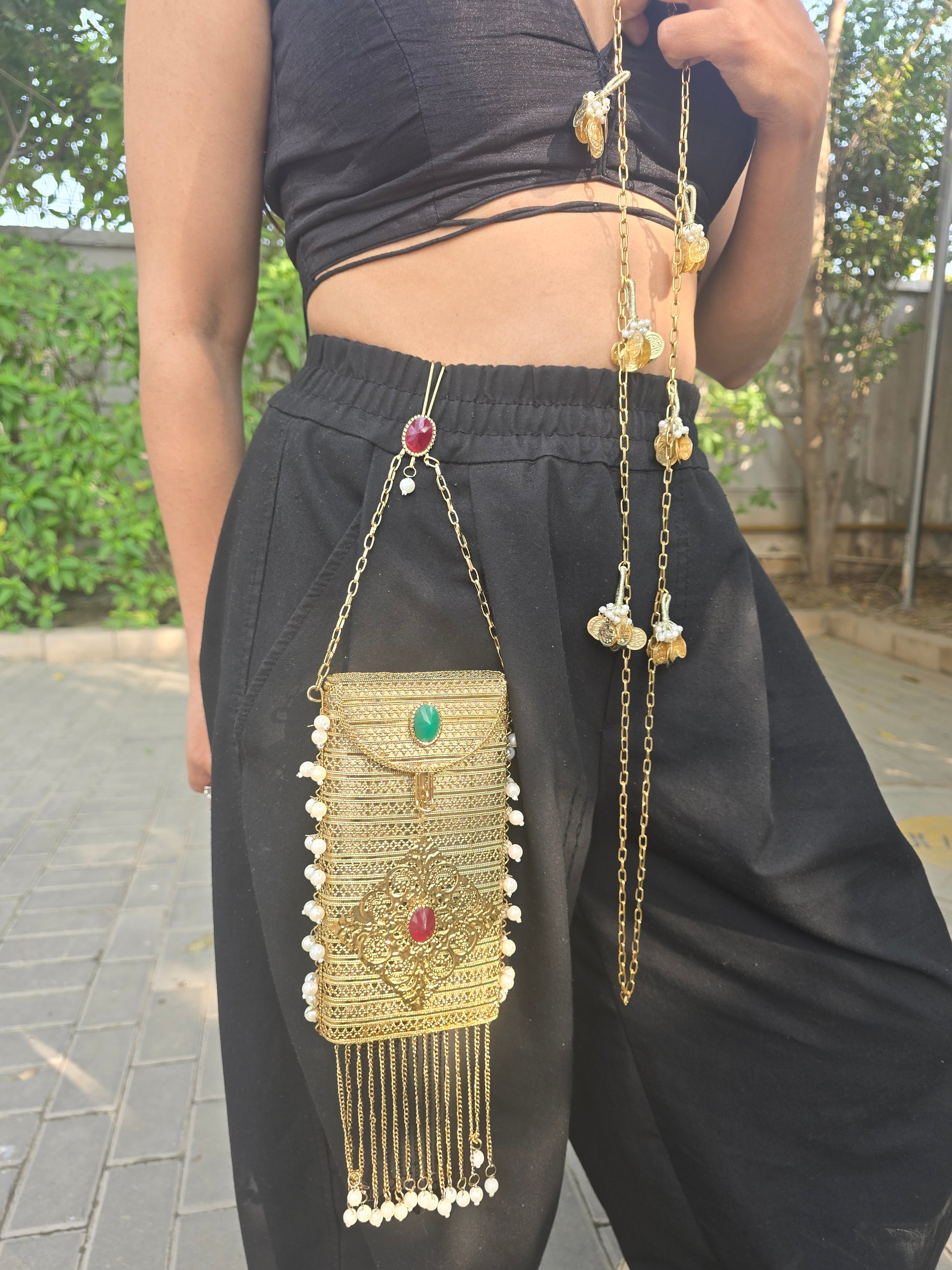 Designed for versatile styling, the pouch features a waist hook for lehengas and sarees, along with a complimentary long detachable chain for shoulder or crossbody wear—making it ideal for weddings, festive celebrations, and special occasions.