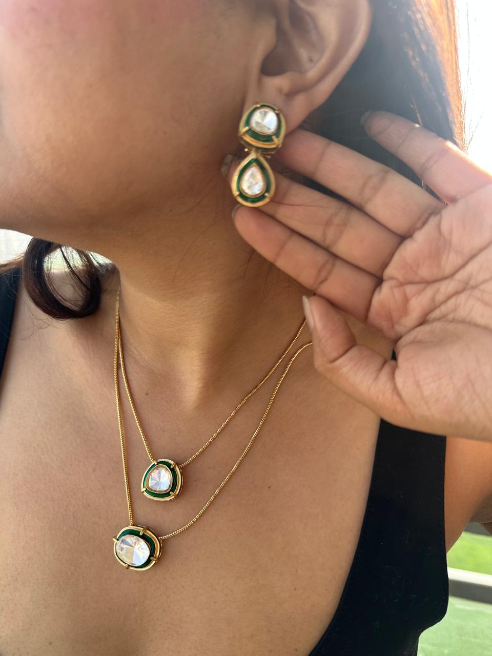 Finished with matching polki earrings, this set is perfect for festive celebrations, weddings, cocktail evenings, destination events, and elevated everyday styling.