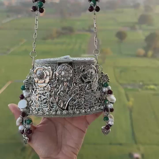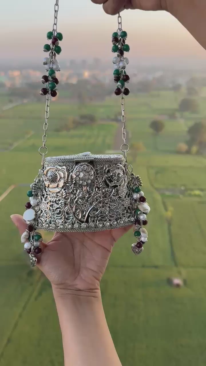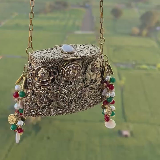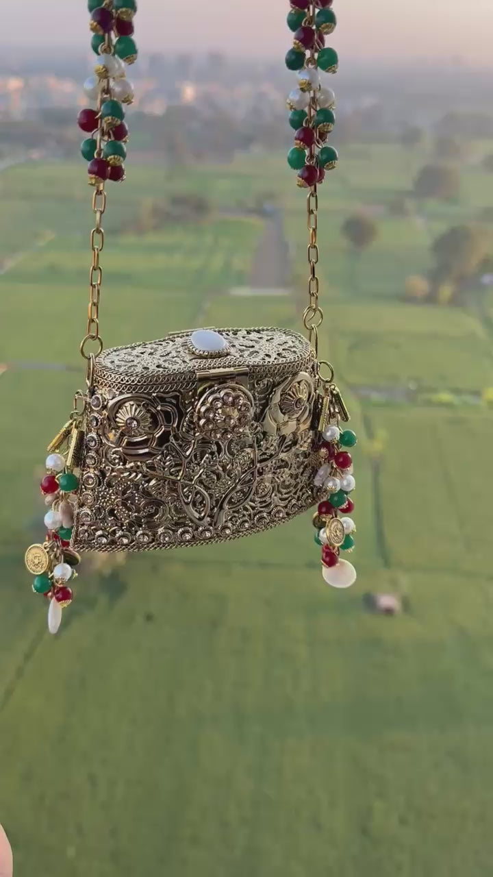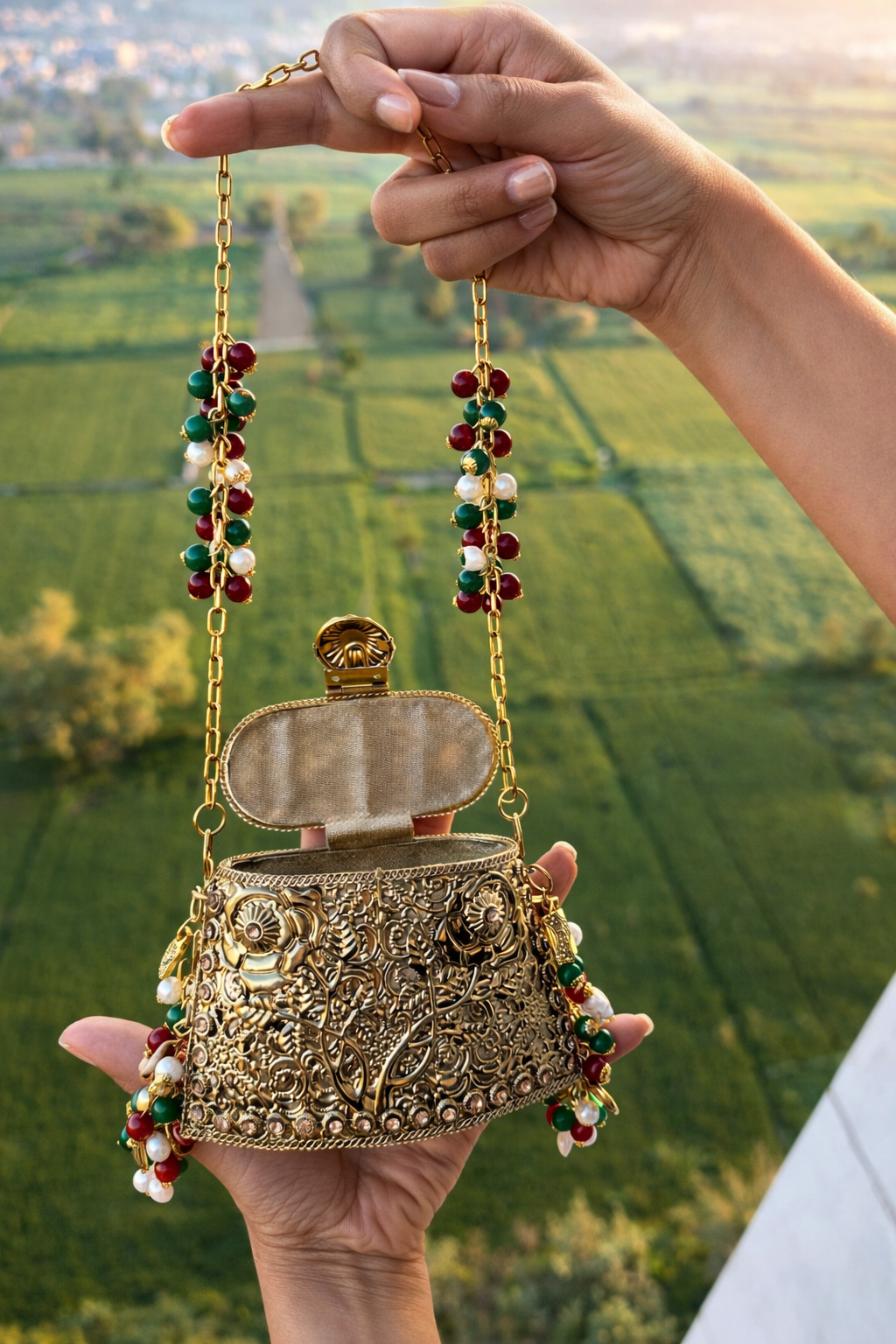 A timeless mini clutch handcrafted in antique gold and silver finish, featuring intricate filigree work and delicate bead detailing on the strings. Accented with pearls and green-maroon beads, this elegant potli-style clutch is perfect for weddings, festive occasions, and evening celebrations.