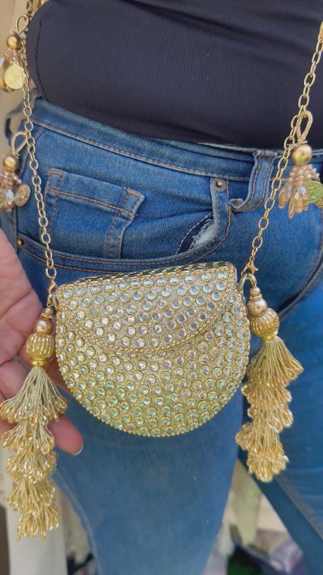 • Ornate Charm Sling: The long gold-link chain is elevated with metallic coin-style charms and crystal droplets, allowing the strap to double as a piece of wearable jewelry.