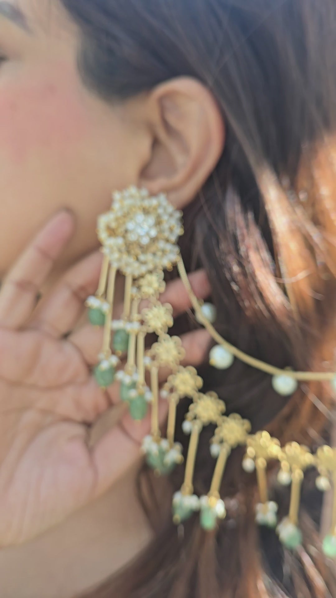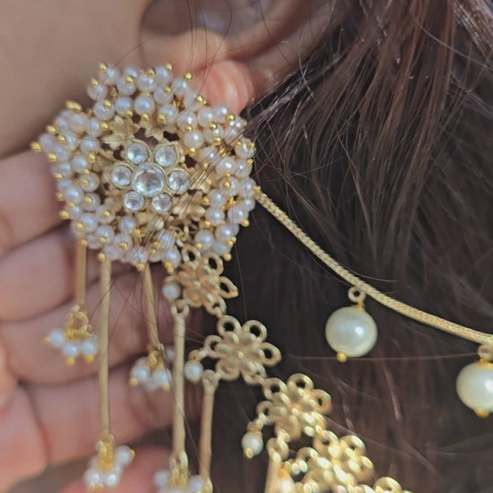 Bahubali Kundan Matt Ear Sahara Earrings with Triple-Layer Kaanchain (ear chain)