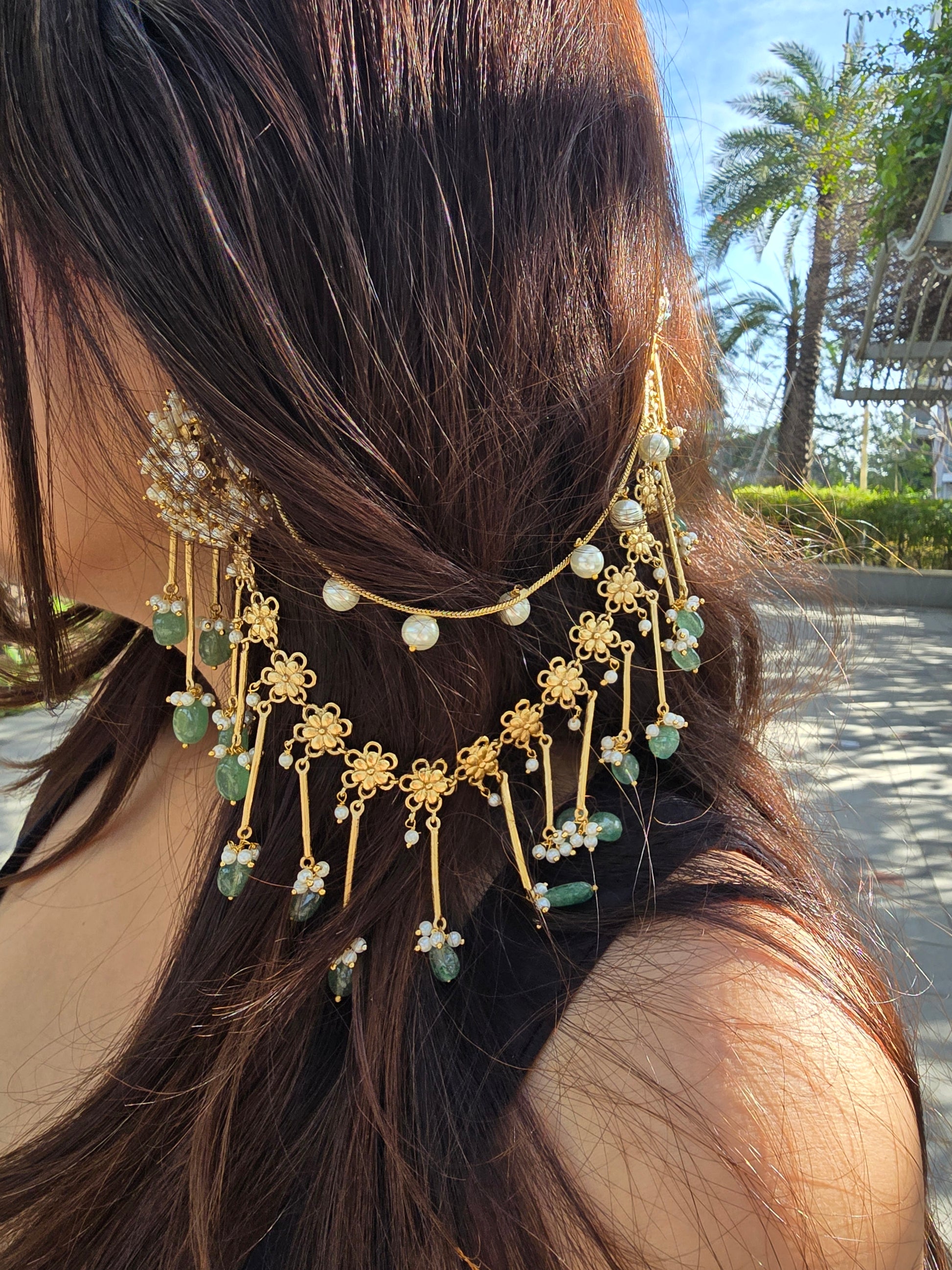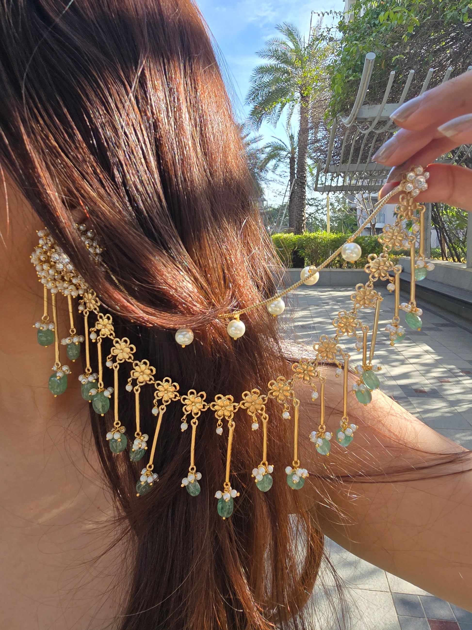 Featuring hand-set kundan stones in a rich matt gold finish, the design is elevated with an exquisite three-layer kaanchain that drapes gracefully along the hairline.